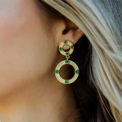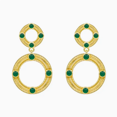 •  These 18k gold-plated double-circle earrings, featuring gemstone  details, measure 1.75 inches in diameter. Handmade in Brazil, they offer  a blend of elegance and artisanal craftsmanship. The double-circle  design creates a dynamic visual effect, while the gemstones add a touch  of sparkle and sophistication. These earrings are perfect for making a  statement with a refined and distinctive style.