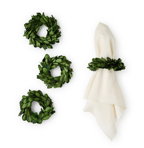 Bring a natural touch to your table setting with this beautifully crafted set of preserved boxwood wreath napkin rings. Made from real boxwood leaves, each piece showcases slight variations for a unique and organic look. Perfect for holiday gatherings or year-round use, these napkin rings add charm and texture to any dining arrangement.