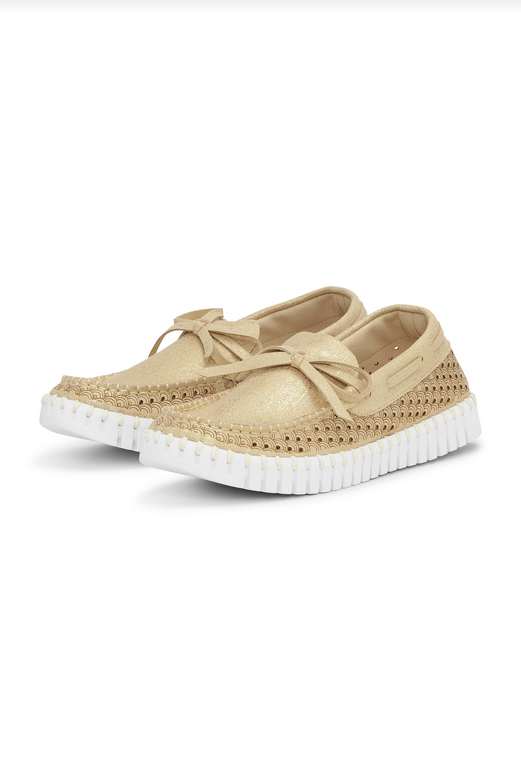 •  A classic loafer that is both comfortable and polished.Step up your  style with the Women's Metallic Tulip Slip-on by Ilse Jacobsen, the  perfect blend of comfort and sophistication. Crafted from 60% Nylon and  40% Polyurethane, these flats feature a striking metallic-effect gold  upper with a decorative laser-cut design. The shoes boast a flexible  Tulip outsole made from 75% natural rubber and 25% recycled rubber,  stitched with color-matched recycled thread for a glue-free  construction. With a softly padded insole composed of 60% EVA and 40%  pig suede, these flats offer all-day arch support and comfort, ideal for  both casual and slightly dressier occasions.