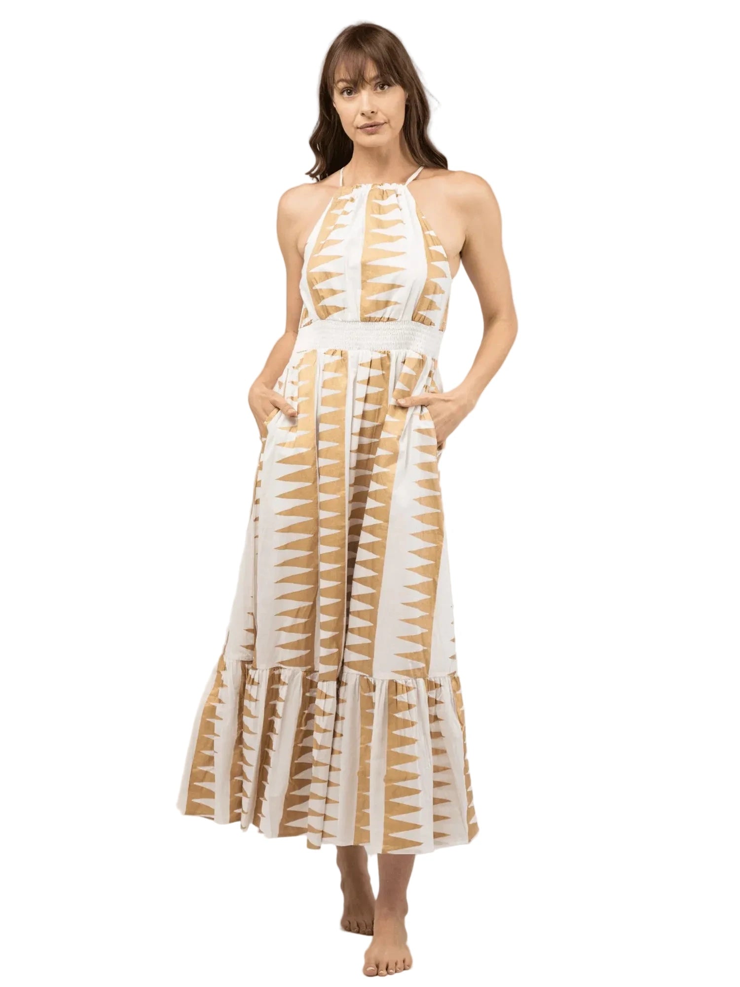 The Jenna Dress in Edgy Gold is your new go-to for effortless style and comfort. Featuring a high neckline and a smocked waistline that flatters every figure, this dress also has pockets.
