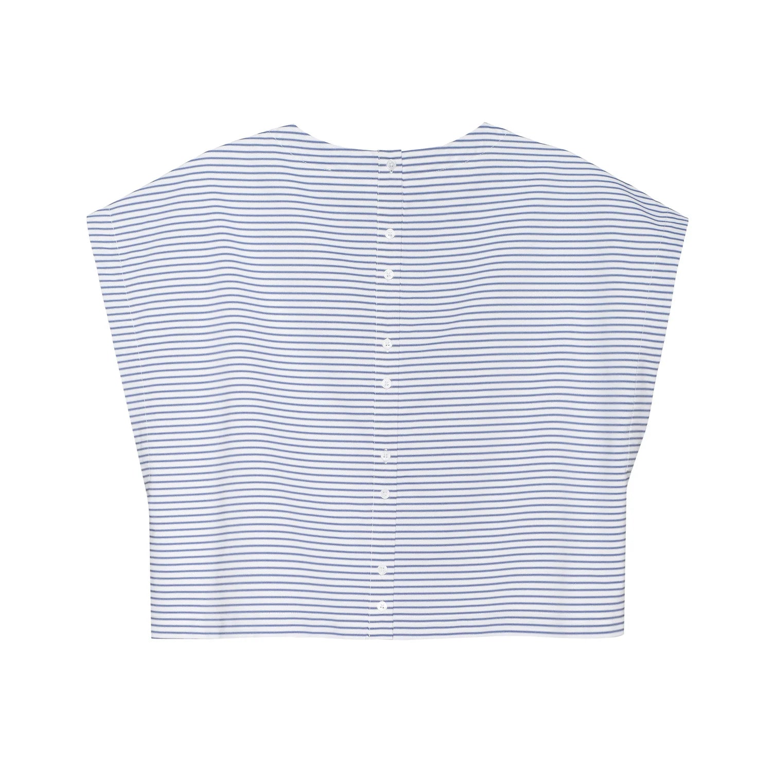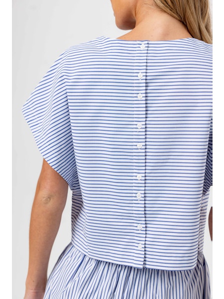 Esme is designed with an intentionally boxy silhouette through the body, finished with a distinctive button-up back for a modern, unexpected detail. Made in our 100% Cotton Poplin, in a fresh Navy Stripe it has a silky hand feel.